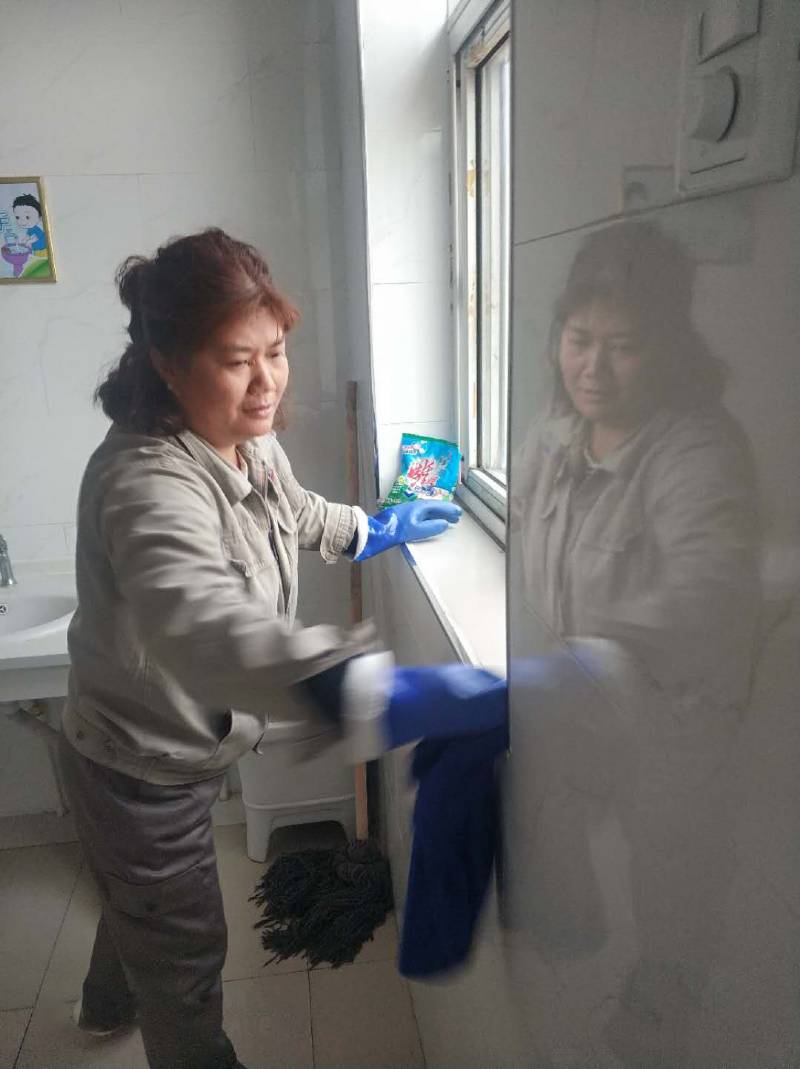 在職工陸續上崗時,她又拿起笤帚打掃起宿舍、走廊來,并用投洗了幾遍的墩布,仔細地擦拭著房間里的犄角旮旯,直到地面上“照出人影來”才肯罷休。來不及歇息,她又緊接著趕赴下一個“戰場”——衛生間。通風、沖洗、消毒、清掃、擦拭、晾曬、整理,這一整套工作她只用30多分鐘就搞定了。
