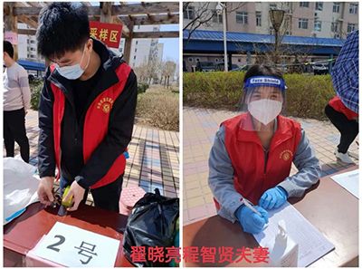 居家辦公的共產(chǎn)黨員陳玲、李國剛夫婦,主動申請加入鹽場新區(qū)志愿服務(wù)隊,兩人相互鼓勵,并肩作戰(zhàn),積極配合醫(yī)務(wù)人員、社區(qū)工作人員做好信息核實(shí)登記、現(xiàn)場布置、發(fā)動喊人、維持秩序、場地消毒、深夜照明等項工作,并主動提供桌椅板凳以供檢測使用。