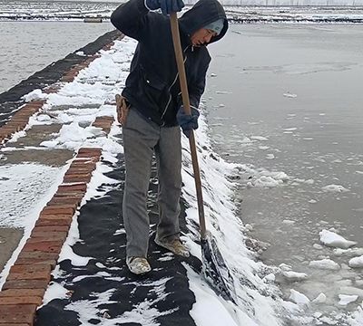 長蘆公司安排各單位清除門前、道路、生活區積雪。一線各單元及時清除塑苫積雪,用適當濃度鹵水對趕鹵池進行灌池化雪和串壕化雪。