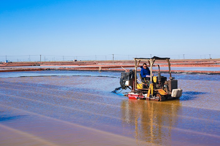 青鋒公司鹽區四副灘同時開耙,扒鹽、活茬全部采用機械作業。目前,鹵水充足,每天可完成2個結晶池收鹽。