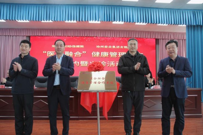 在參會人員的共同見證下,張立莊、徐聞鉑分別代表滄鹽集團、滄州市婦幼保健院簽訂了“醫企融合”健康管理合作意向書。張立莊、狄彬、徐聞鉑、崔國光共同為“醫企融合”健康管理合作單位揭牌。崔國芳代表滄鹽集團現場接受了滄州市婦幼保健院捐贈的1600余張健康服務卡。